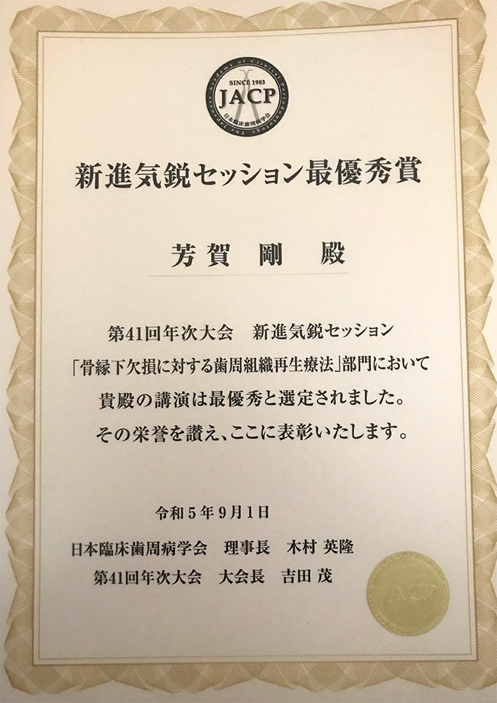 臨床歯周病学会年次大会にて最優秀賞受賞