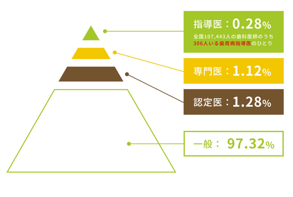 そのため、日本全国に約10万人以上いる歯科医師の中でも、歯周病専門医はわずか1%以下(約1,300名)しか存在しません。