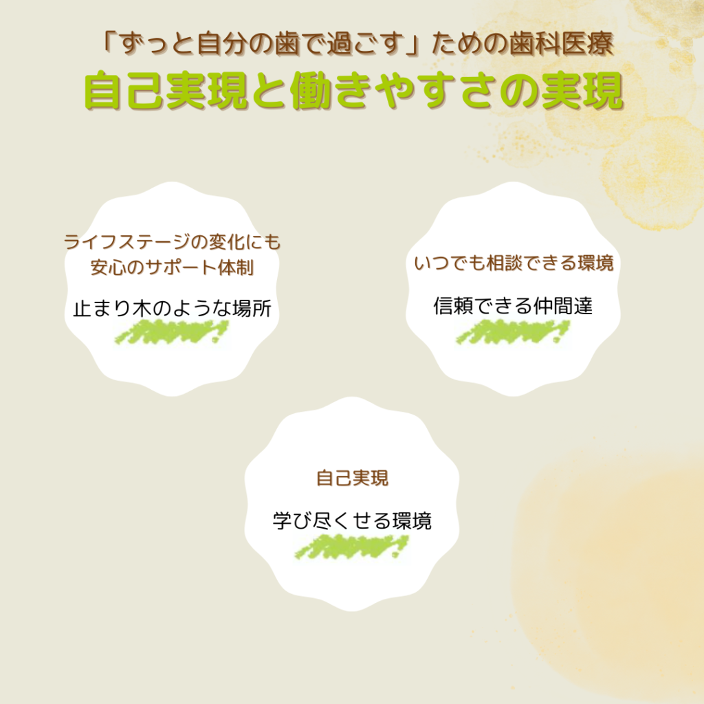 #産休、育休取得100%#院内勉強会#歯周病学会認定衛生士取得可能#時短勤務可能(出産後、子育て中のママ、介護が必要になったetc)#学会参加発表支援(院長学会にて最優秀賞受賞歴あり)#勉強会参加支援#定期面談あり(なんでも相談できる環境)#院長は怒らない#院長はまじめ#勤務医がたくさん(全員女性)#幅広い年齢層の歯科衛生士(20代、30代、40代、50代)#希望有給取得率100%#有給で旅行#土曜日に有給#SRP時のキュレット配布(マイキュレット 愛着!)#院内wifi使い放題#制服、上履き、ズボン支給#インカム支給#メンテナンス中心、アシスタント中心選択可能#適材適所#矯正にどっぷりも可能#広いスタッフルーム#昼休みはユニットで昼寝も可能#スタッフルームにはお菓子満載#メンテナンスは60分/一枠