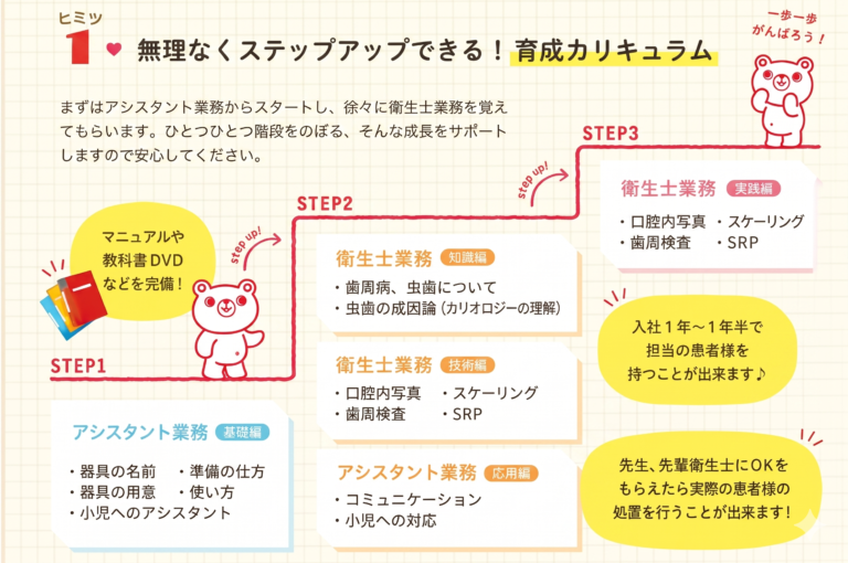 | 入社後の教育体制 | 教育カリキュラムに基づいて、先輩DHが教育担当としてあなたのペースに合わせてお教えします。予防歯科を重点的に行っていきたい方は、新卒の方でも入社1年~1年半で担当の患者様を持つことができるようになります。<その他> 日本歯周病学会認定医、日本臨床歯周病学会認定医が在籍していますので、興味がある方は『認定衛生士』の資格取得の支援をします。また、希望者には研修会等の費用を補助+交通費支給します。院長が講師を務める予防歯科セミナー等にも参加可能です! |